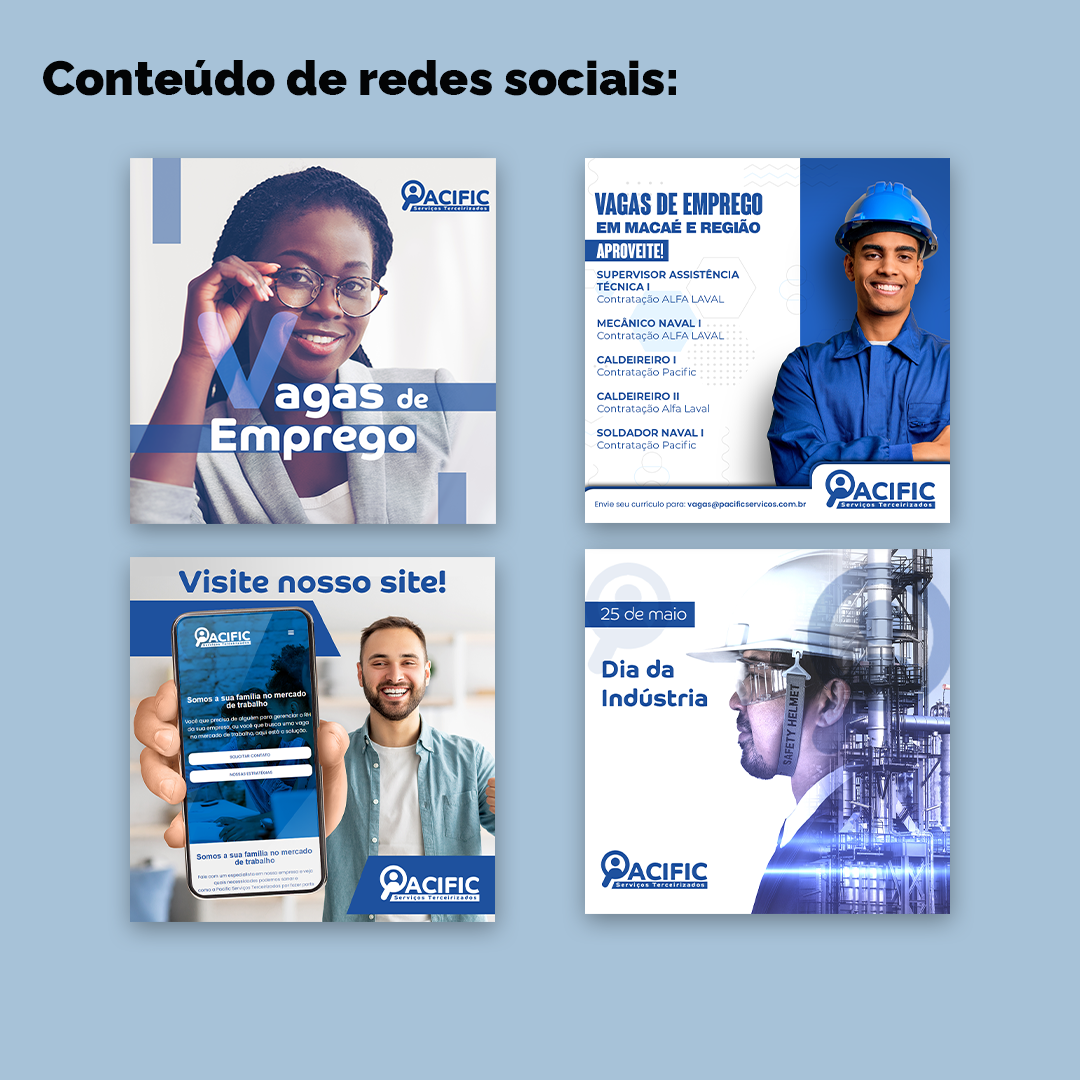 Através da agência Chave Preta fizemos o Rebranding da empresa de RH - Pacific Serviços Terceirizados - com criação de identidade visual contendo material gráfico, digital e nova persona para a marca.